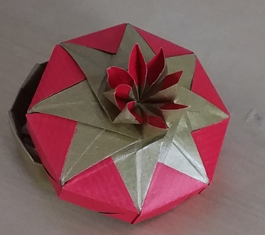 We maken een doosje met een deksel bestaande uit 8 elementen Het doosje krijgt een doorsnee van 8,5cm. Geduld is nodig bij het in elkaar bevestigen van de delen. Als er genoeg tijd over is maken we nog een doosje (uit 1 stuk papier). Papier en tekening hiervoor krijg je in ieder geval ook mee naar huis!